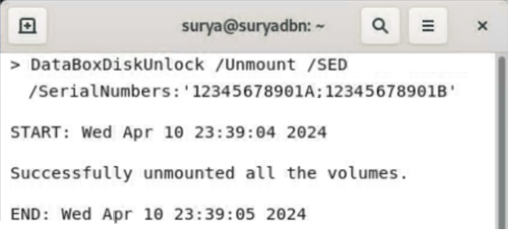sudo ./DataBoxDiskUnlock /unmount /SerialNumbers: 'serialNumber1;serialNumber2'