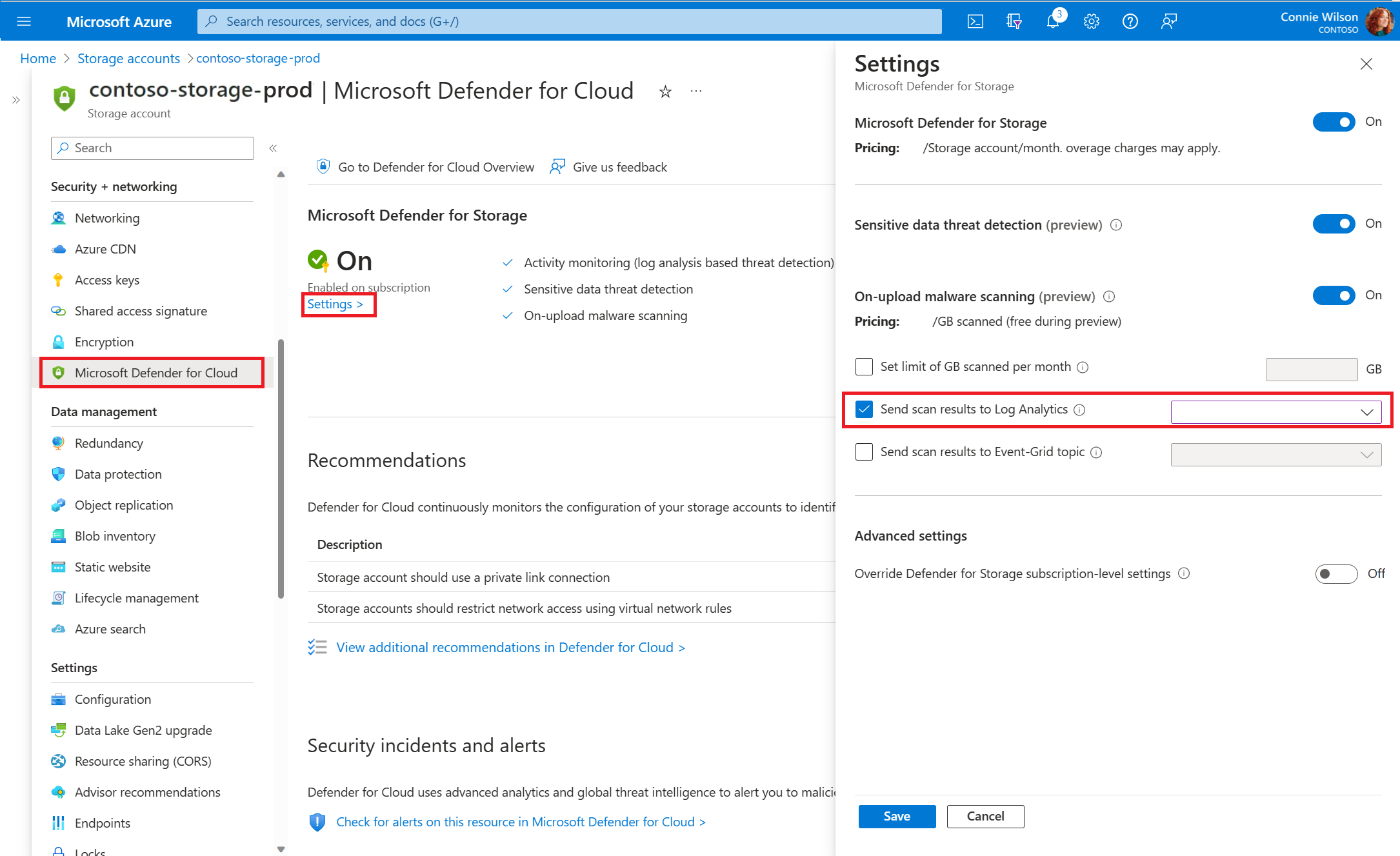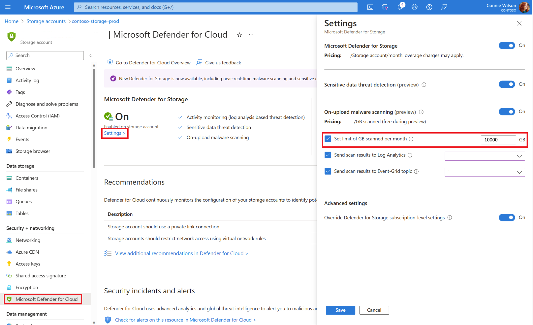 Set the status of Override Defender for Storage subscription-level settings (under Advanced settings) to On. This ensures that the settings are saved only for this storage account and aren't overrun by the subscription settings.