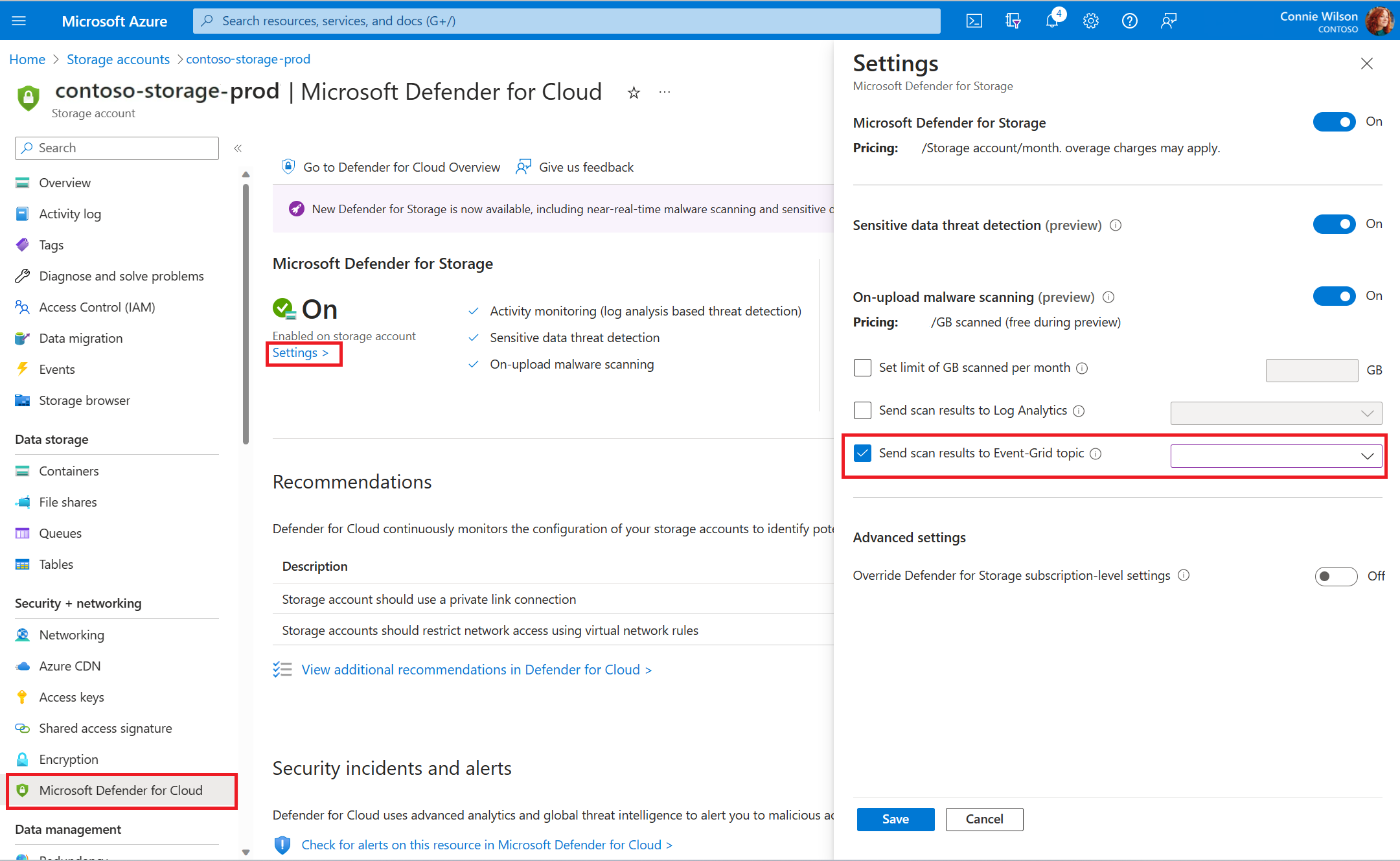 To configure the Event Grid custom topic destination, go to the relevant storage account, open the Microsoft Defender for Cloud tab, and select the settings to configure.