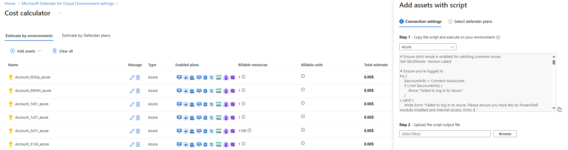 - Add assets from onboarded environments: Recommended - Add assets from environments already onboarded to Defender for Cloud. This method covers all plans for Azure and works faster than the script option.