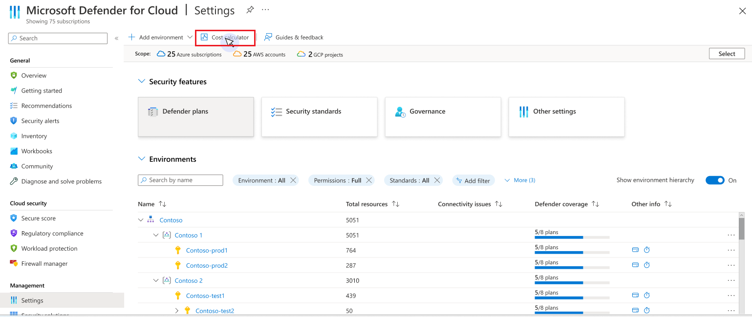 To use the Defender for Cloud Cost Calculator, go to the Environment Settings section of Microsoft Defender for Cloud. Select the Cost Calculator button located in the upper section of the interface.