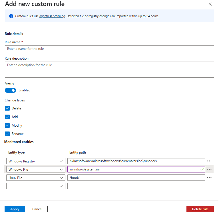 Select the Change types and define Entity type and Entity path for your custom rules.