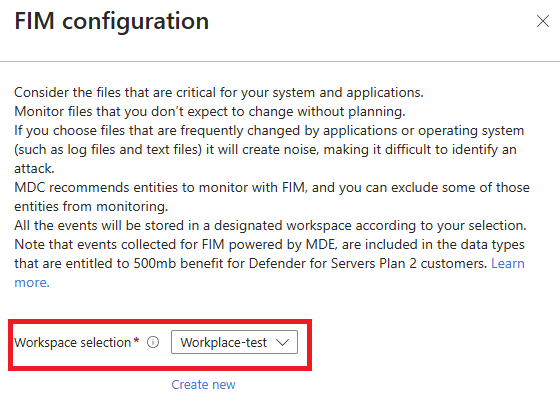Select a workspace to store the File Integrity Monitoring data. (Optional) Or, select Create new to create a new workspace.