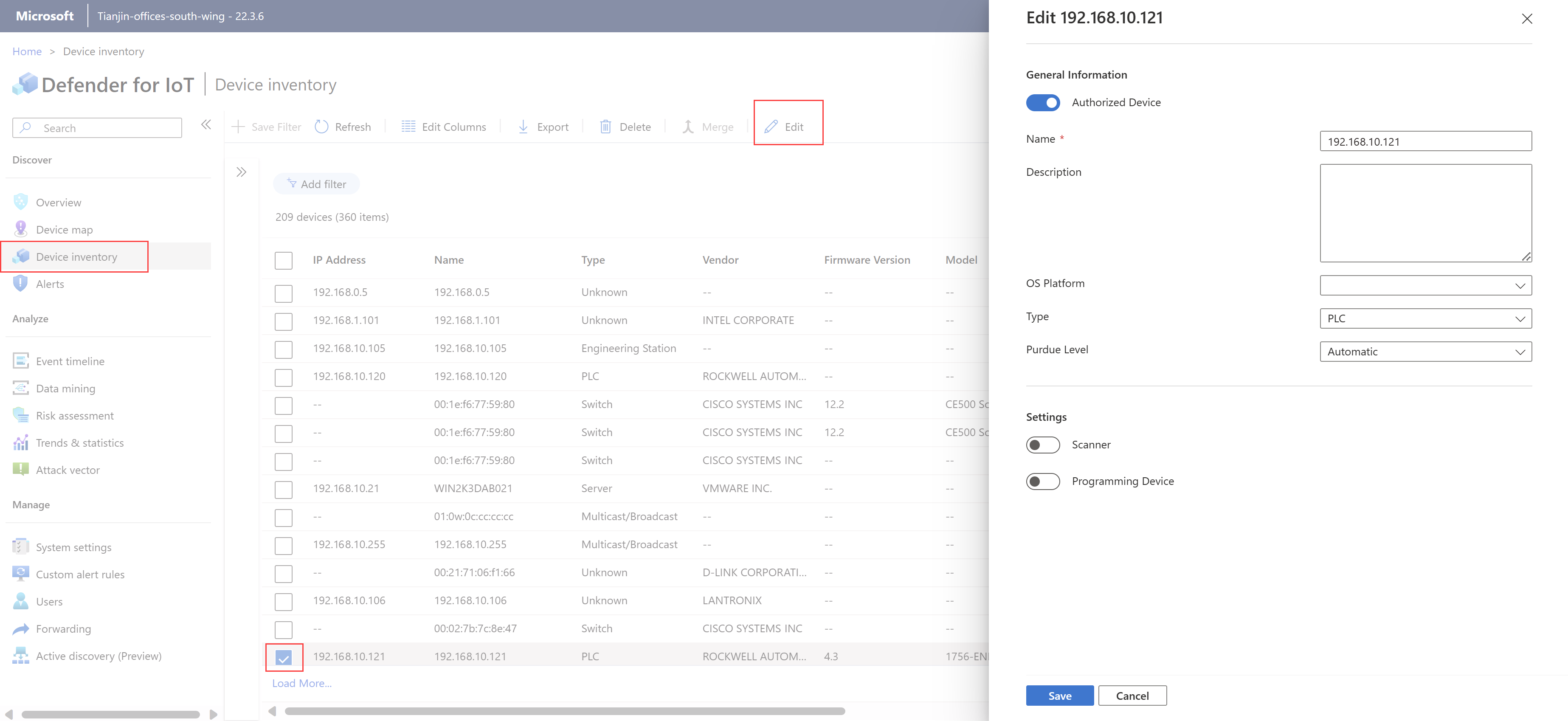 Name Description Authorized Device Select if the device is a known entity on your network. Defender for IoT doesn't trigger alerts for learned traffic on authorized devices. Name By default, shown as the device's IP address. Update this to a meaningful name for your device as needed. Description Left blank by default. Enter a meaningful description for your device as needed. OS Platform If the operating system value is blocked for detection, select the device's operating system from the dropdown list. Type If the device's type is blocked for detection or needs to be modified, select a device type from the dropdown list. For more information, see Supported devices. Purdue Level If the device's Purdue level is detected as Undefined or Automatic, we recommend selecting another level to fine-tune your data. For more information, see Placing OT sensors in your network. Scanner Select if your device is a scanning device. Defender for IoT doesn't trigger alerts for scanning activities detected on devices defined as scanning devices. Programming device Select if your device is a programming device. Defender for IoT doesn't trigger alerts for programming activities detected on devices defined as programming devices. Select Save to save your changes.