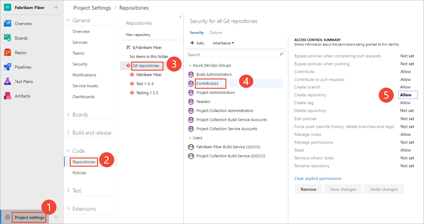 For example, here we choose (1) Project Settings, (2) Repositories, (3) Git repositories, (4) the Contributors group, and then (5) the permission for Create repository.