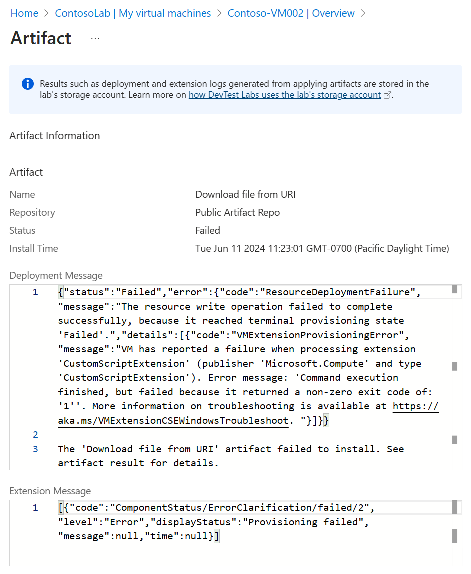 Go to the Artifacts list page for the lab VM, and select the artifact with the Failed status: