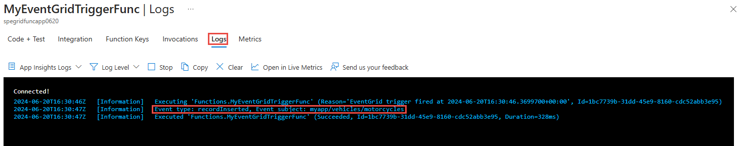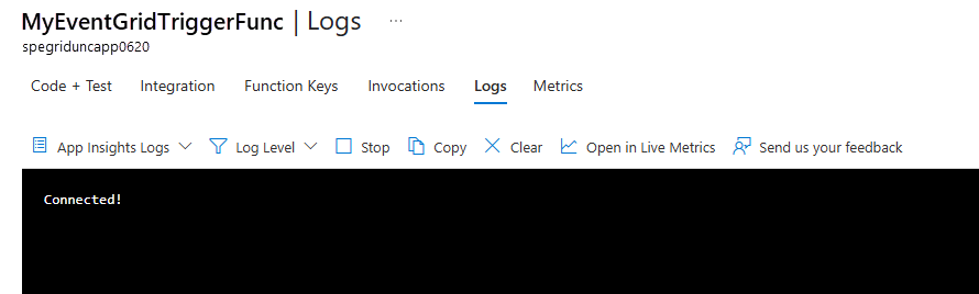 curl -X POST -H "aeg-sas-key: $key" -d "$event" $endpointConfirm that the message from the function appears on the Logs tab for your function in the Azure portal.