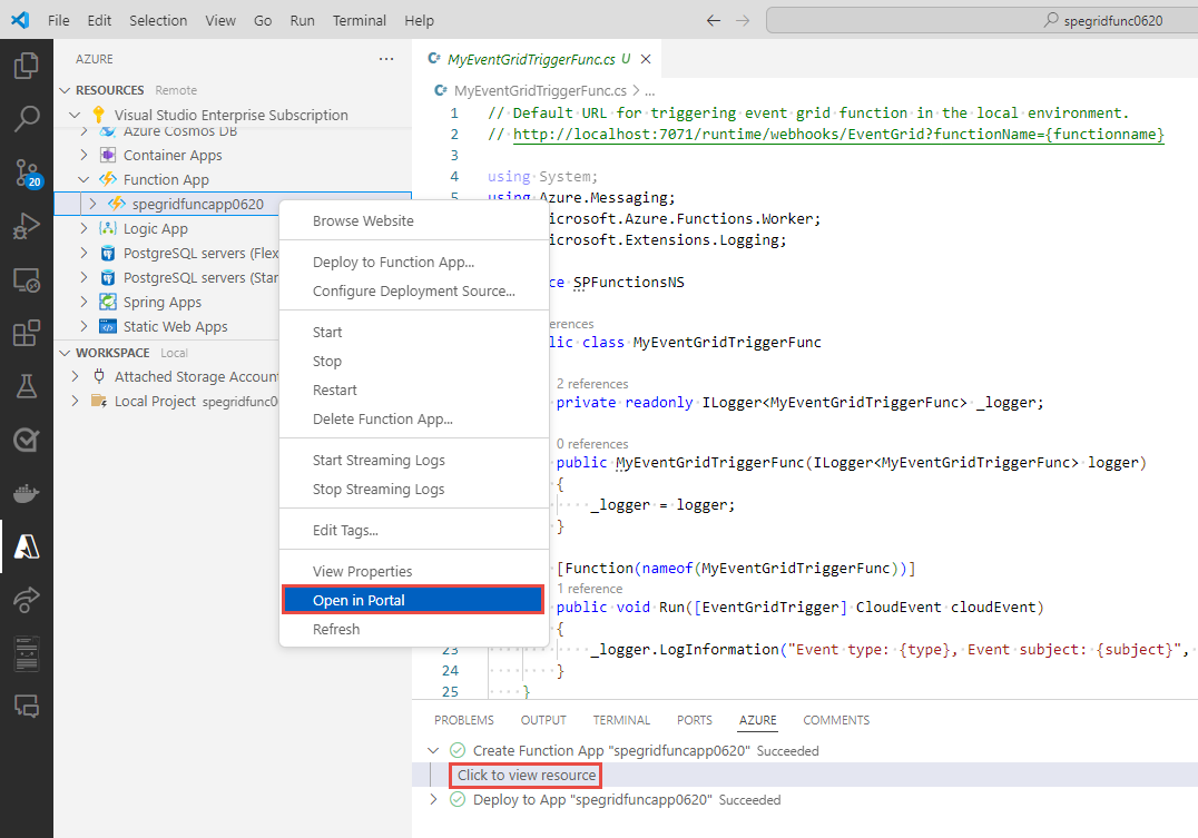 Runmethod. It prints the information by using a logger.[Function(nameof(MyEventGridTriggerFunc))] public void Run([EventGridTrigger] CloudEvent cloudEvent) { _logger.LogInformation("Event type: {type}, Event subject: {subject}", cloudEvent.Type, cloudEvent.Subject); }
