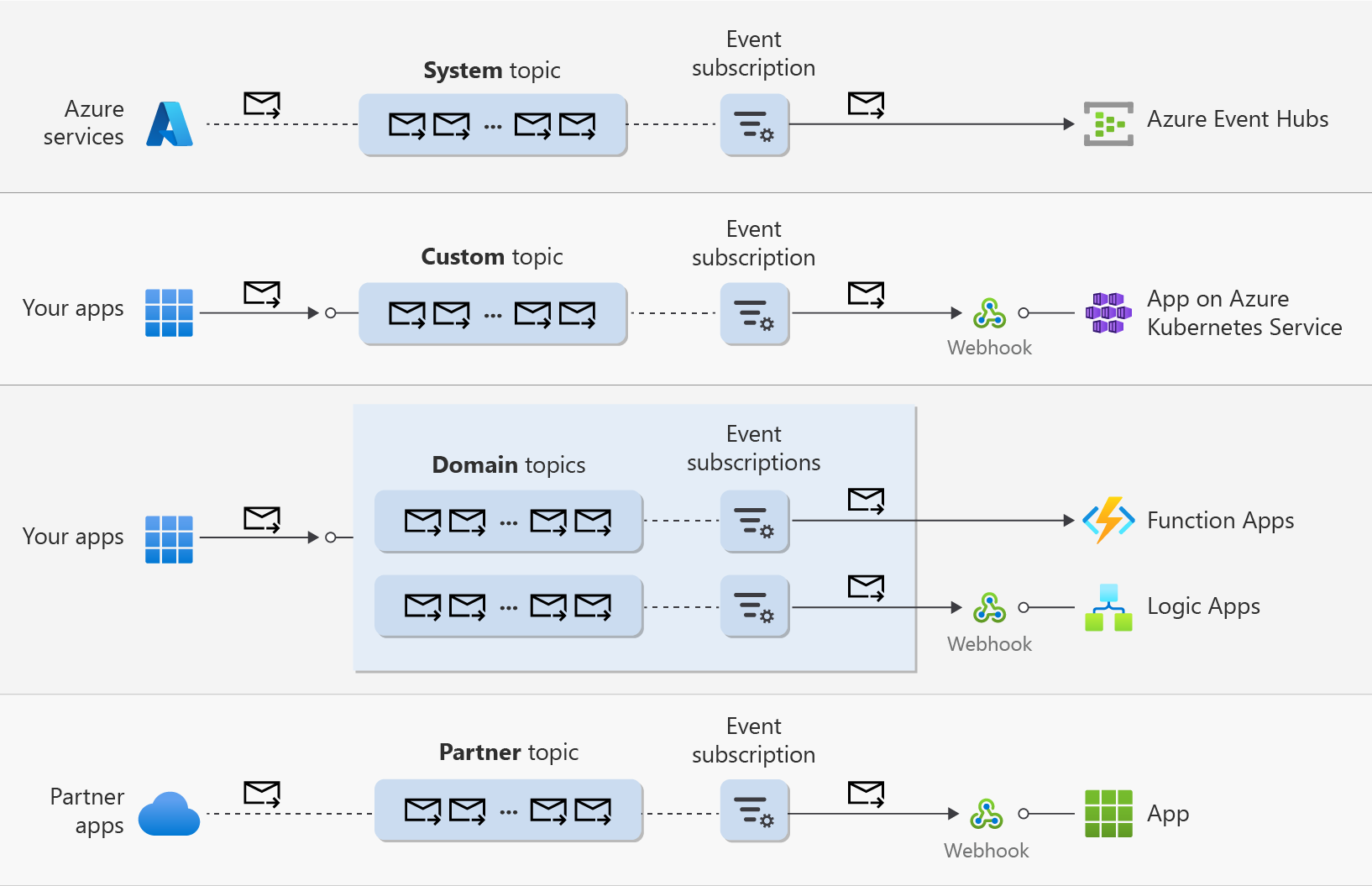 - Domains. Domains represent a group of domain topics typically associated with a single application that requires sending events to different group of users, organizations, or applications. A common approach is to associate a domain topic with a group of target applications or users of an organization within the same tenant. An organization can be a team, a division in company, a company, etc.