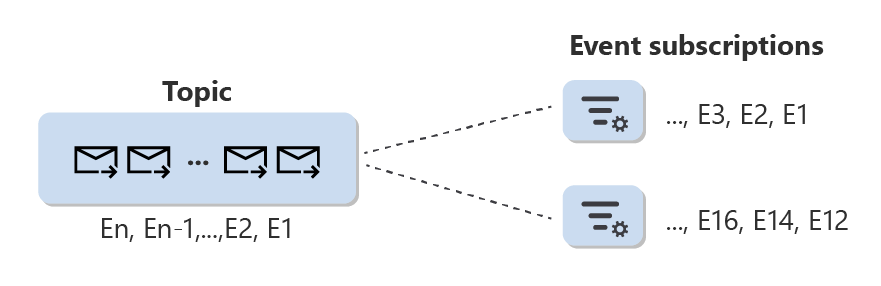 Events published to Event Grid land on a topic, which is a resource that logically contains all events. An event subscription is a configuration resource associated with a single topic. Among other things, you use an event subscription to set event selection criteria to define the event collection available to a subscriber out of the total set of events present in a topic.