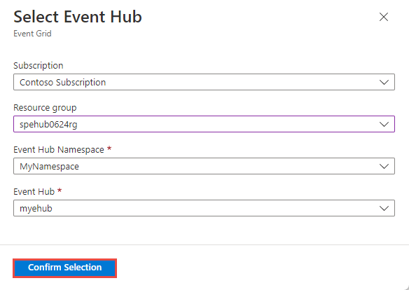 On the Select Event Hub page, select configurations for the endpoint, and then select Confirm Selection.