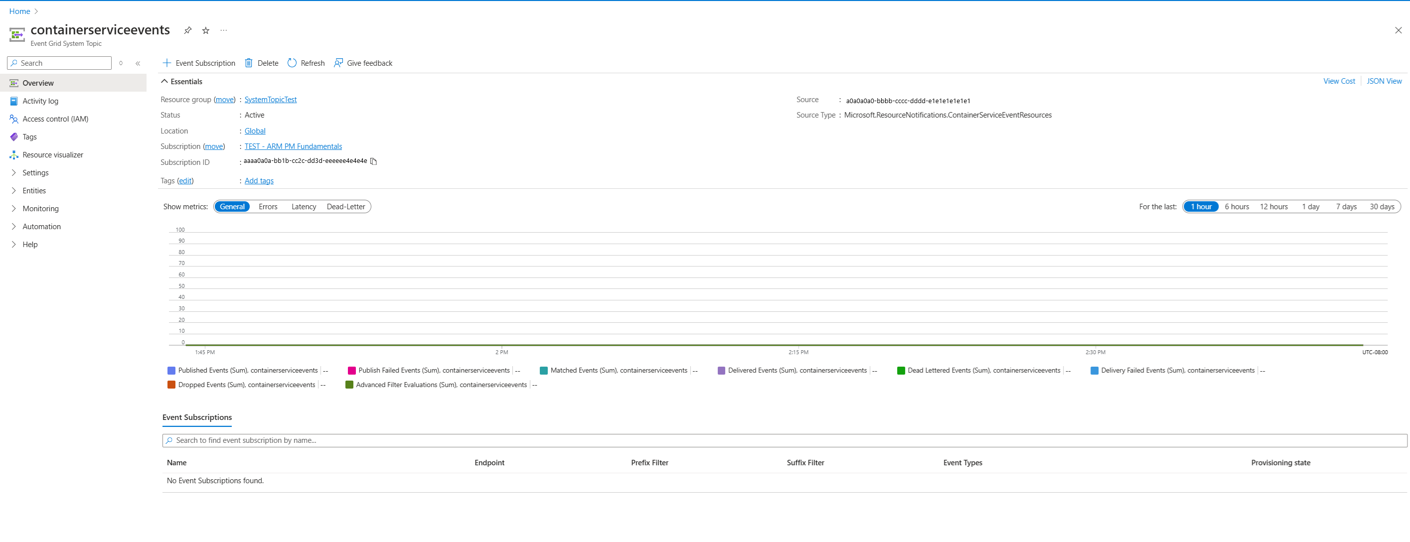 microsoft.resourcenotifications.containerserviceeventresourcesusing theaz eventgrid system-topic createcommand.az eventgrid system-topic create --name SYSTEMTOPICNAME --resource-group RESOURCEGROUPNAME --source /subscriptions/AZURESUBSCRIPTIONID --topic-type microsoft.resourcenotifications.containerserviceeventresources --location Global