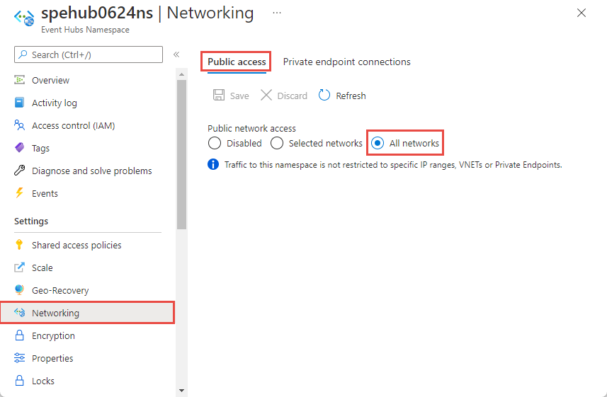 To enable public access, select Public access on the Networking page of the namespace creation wizard.