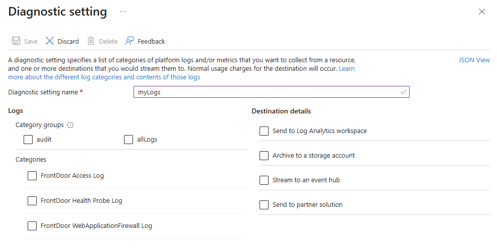 Under Logs, select audit, allLogs, or the individual log you want. Available logs are: FrontDoor Access Log, FrontDoor Health Probe Log, and FrontDoor WebApplicationFirewall Log.
