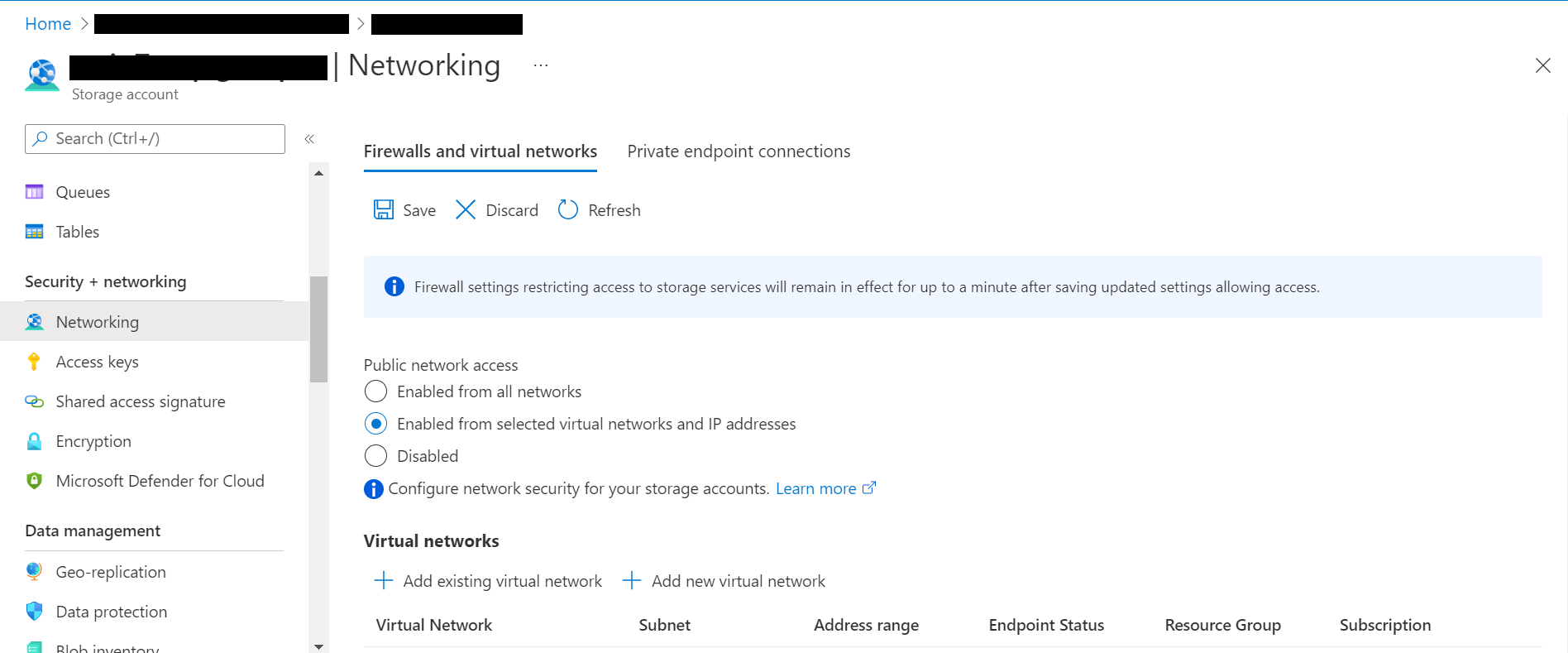 Select Enabled from selected virtual networks and IP addresses.