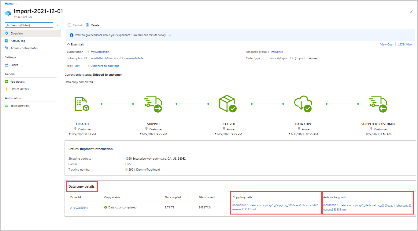 - Review the job information. Make a note of the job name and the Azure datacenter shipping address to ship disks back to. This information is used later on the shipping label.