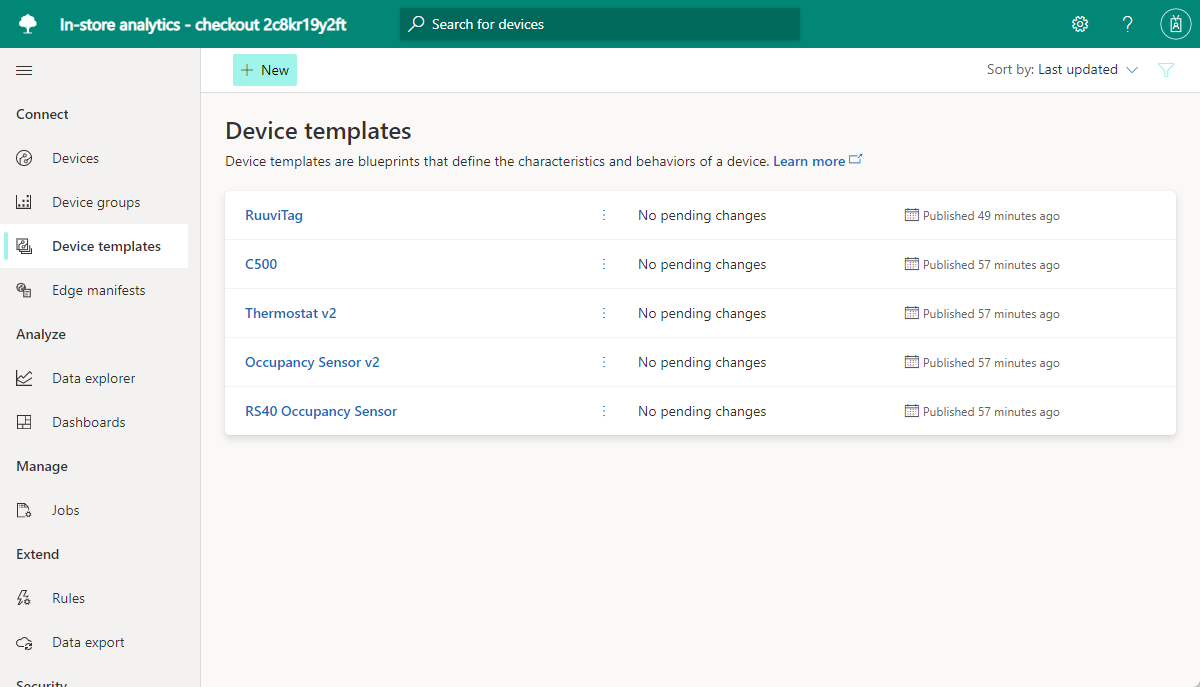 dmr-client export --dtmi "dtmi:rigado:RuuviTag;2" --repo https://raw.githubusercontent.com/Azure/iot-plugandplay-models/main > ruuvitag.jsonOn the left pane, select Device Templates.