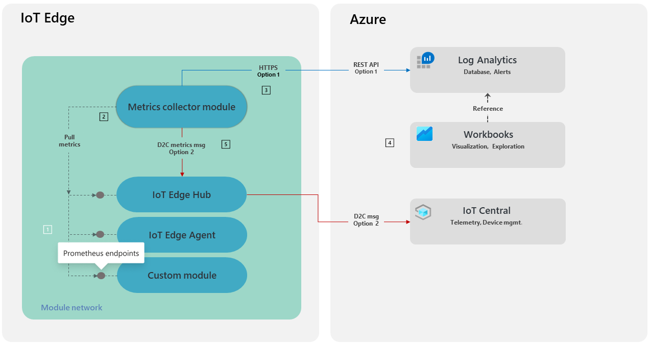 1 Currently, using option 1 to directly transport metrics to Log Analytics from the IoT Edge device is the simpler path that requires minimal setup. The first option is preferred unless your specific scenario demands the option 2 approach so that the IoT Edge device communicates only with IoT Hub.