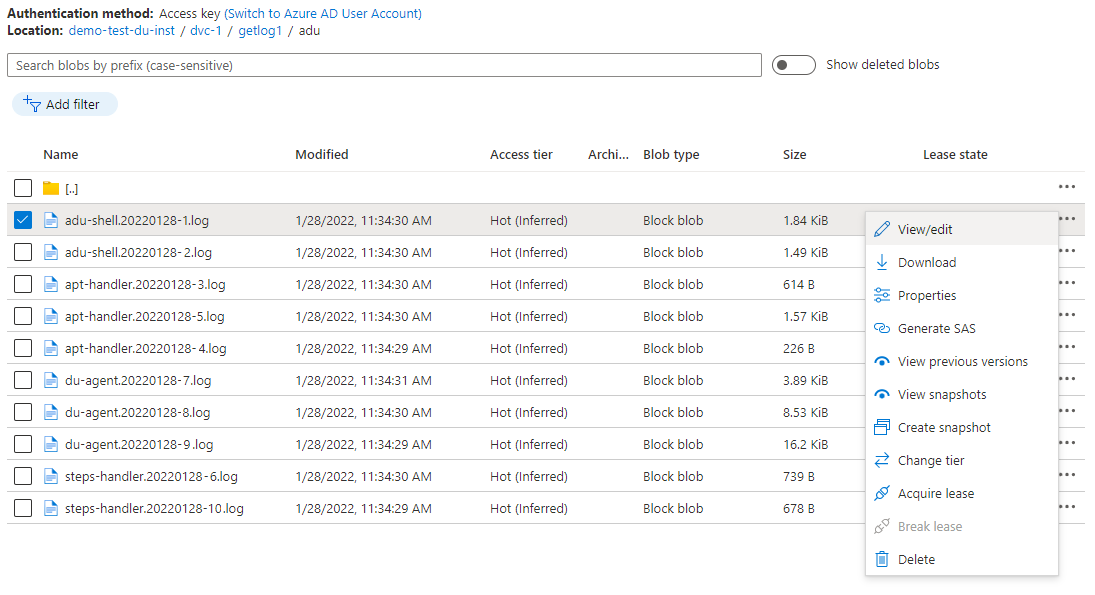 You can view the log file's contents by selecting the file name, then selecting the menu element (ellipsis) and clicking View/edit. You can also download or delete the log file by selecting the respectively labeled options.