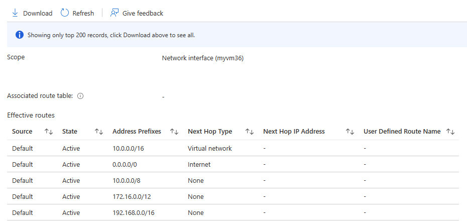 Under Help, select Effective routes to see the all routes associated with the network interface of myVM.