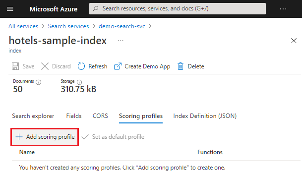 You can add a scoring profile to an index by editing its JSON definition in the Azure portal or programmatically through APIs like Create or Update Index REST or equivalent index update APIs in any Azure SDK. There's no index rebuild requirements so you can add, modify, or delete a scoring profile with no effect on indexed documents.