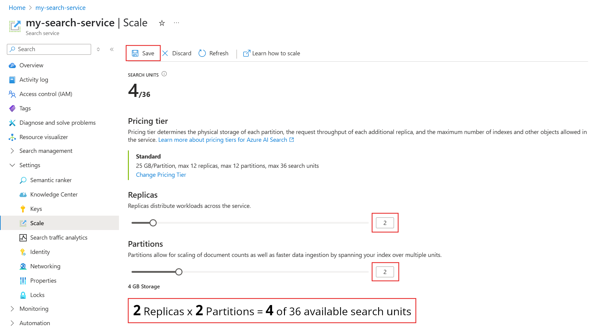 This example adds a second replica and partition. Notice the search unit count; it's now four because the billing formula is replicas multiplied by partitions (2 x 2). Doubling capacity more than doubles the cost of running the service. If the search unit cost was $100, the new monthly bill would now be $400.