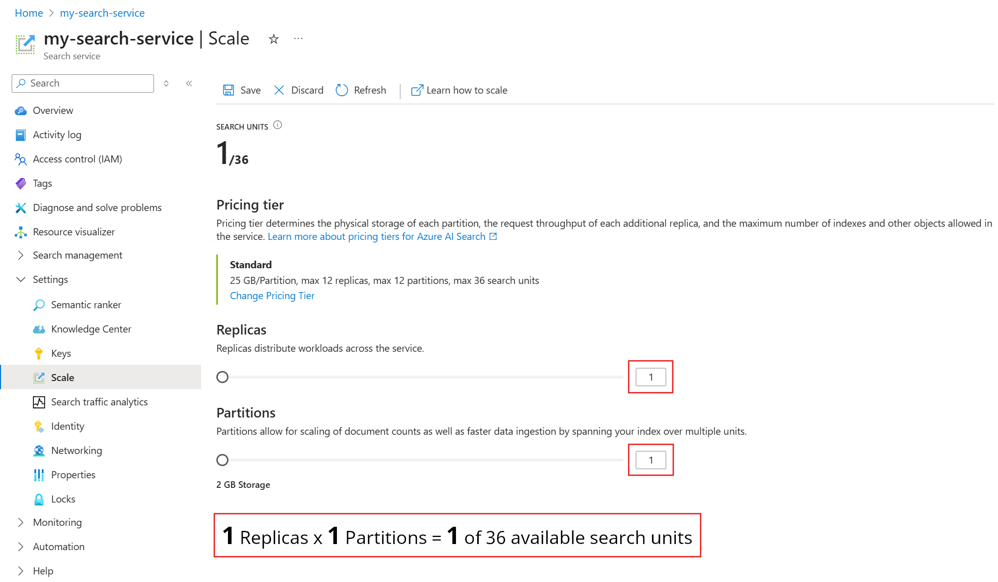 | Search unit | A single increment of total available capacity. A minimum of one search unit is required to run the service. Depending on your pricing tier, the maximum ranges from one to 36 units. The number of search units equals the number of replicas multiplied by the number of partitions: R × P = SU. Each service starts with one replica and one partition, which consumes one unit: 1 × 1 = 1. Adding a second replica consumes two units: 2 × 1 = 2. A search unit is also the billing unit for a search service. |