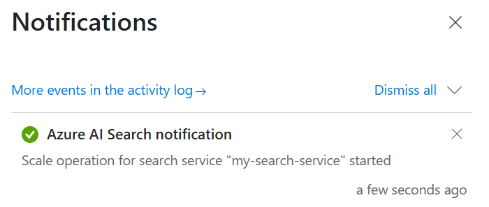| "Service update operations aren't allowed at this time because we're processing a previous request." | Another scaling operation is in progress. | Check the Overview page in the Azure portal or use the Search Management REST API, Azure PowerShell, or Azure CLI to get the status of your search service. If the status is "Provisioning," wait until it becomes "Succeeded" or "Failed" before you try again. 1, 2 |