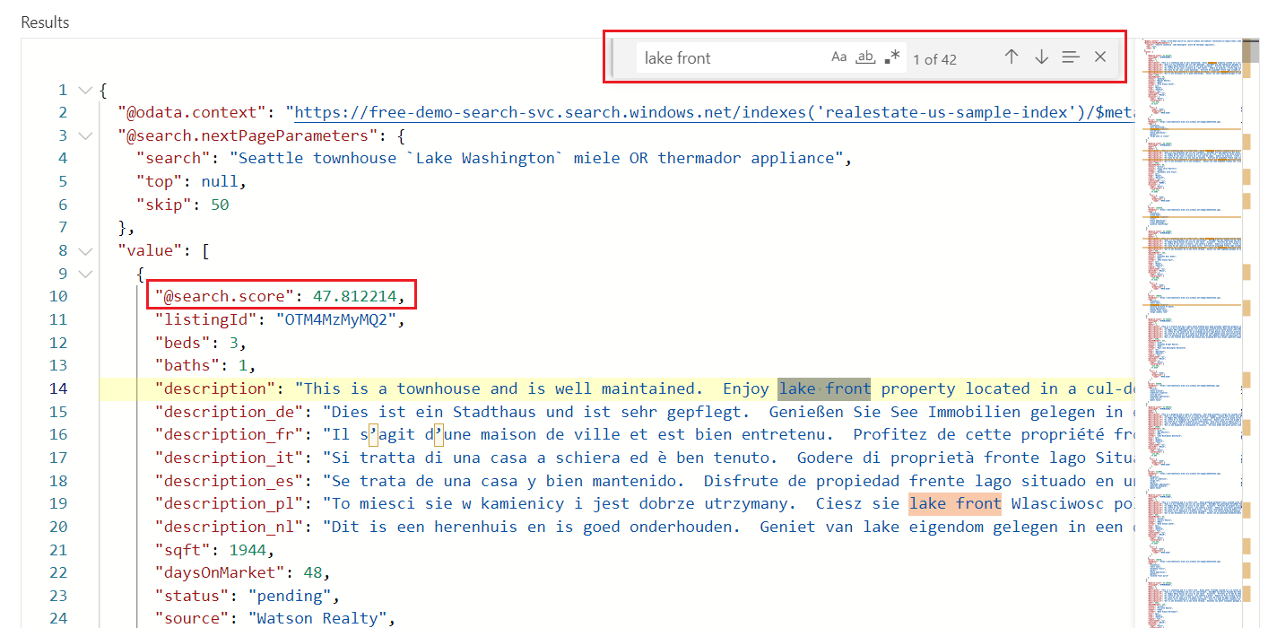 "Seattle apartments lake washington", and then you can use Ctrl-F to find terms within the search results.Query and filter expressions are articulated in a syntax implemented by Azure AI Search. The default is a simple syntax, but you can optionally use full Lucene for more powerful queries. Filter expressions are articulated in an OData syntax.