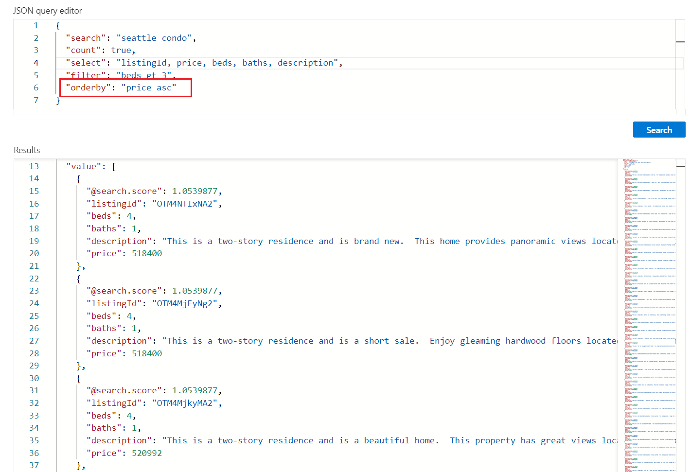 Add orderby to sort results by another field besides search score. The field must be attributed as sortable in the index. In situations where the filtered value is identical (for example, same price), the order is arbitrary, but you can add more criteria for deeper sorting. Here's an example expression you can use to test this out: