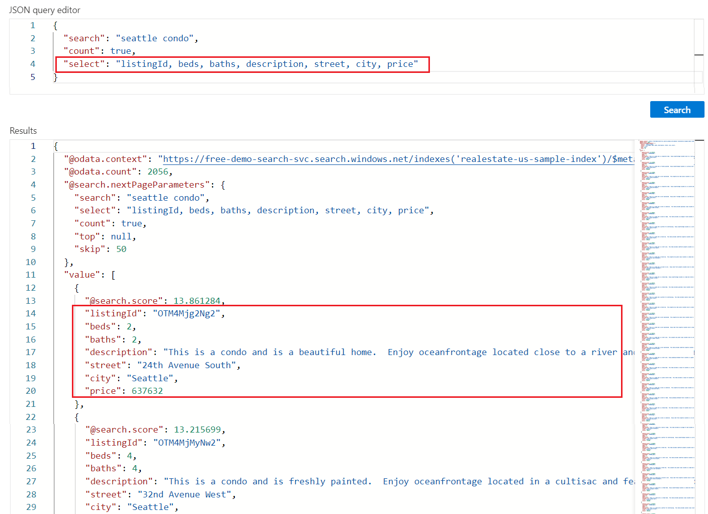 Azure AI Search returns the top-50 matches based on the search rank. To get the next set of matching documents, append "top": 100 and "skip": 50 to increase the result set to 100 documents (default is 50, maximum is 1000), skipping the first 50 documents. You can check the document key (listingID) to identify a document.