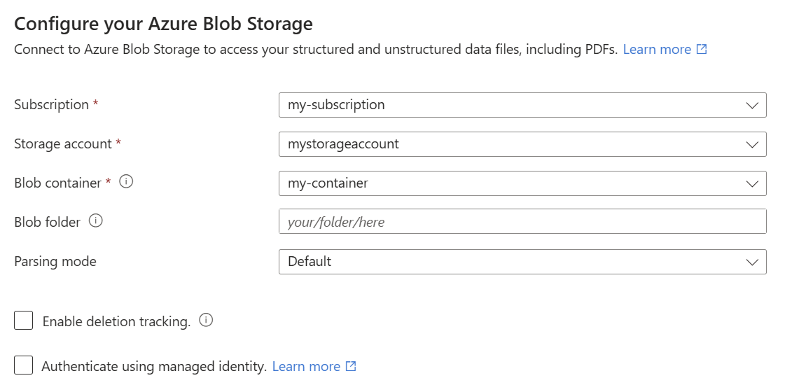 On the Connect to your data page, select the Data Source dropdown list, and then select Azure Blob Storage.