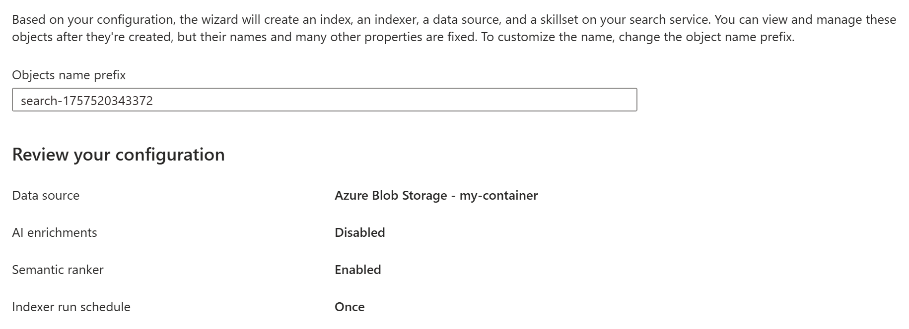 The indexer drives the indexing process and specifies the data source name, a target index, and frequency of execution. In this step, the wizard creates several objects, including an indexer that you can reset and run repeatedly.