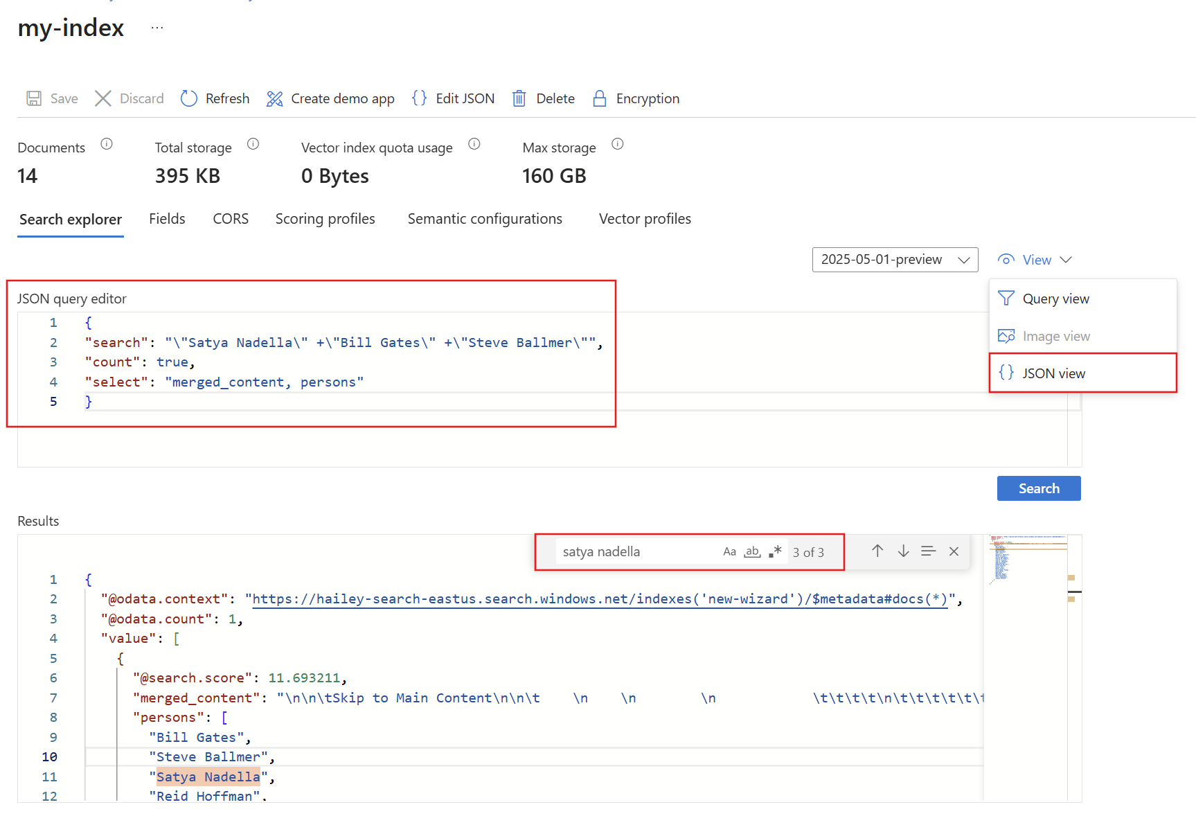 Results are returned as verbose JSON, which can be hard to read, especially in large documents. Here are tips for searching in this tool: