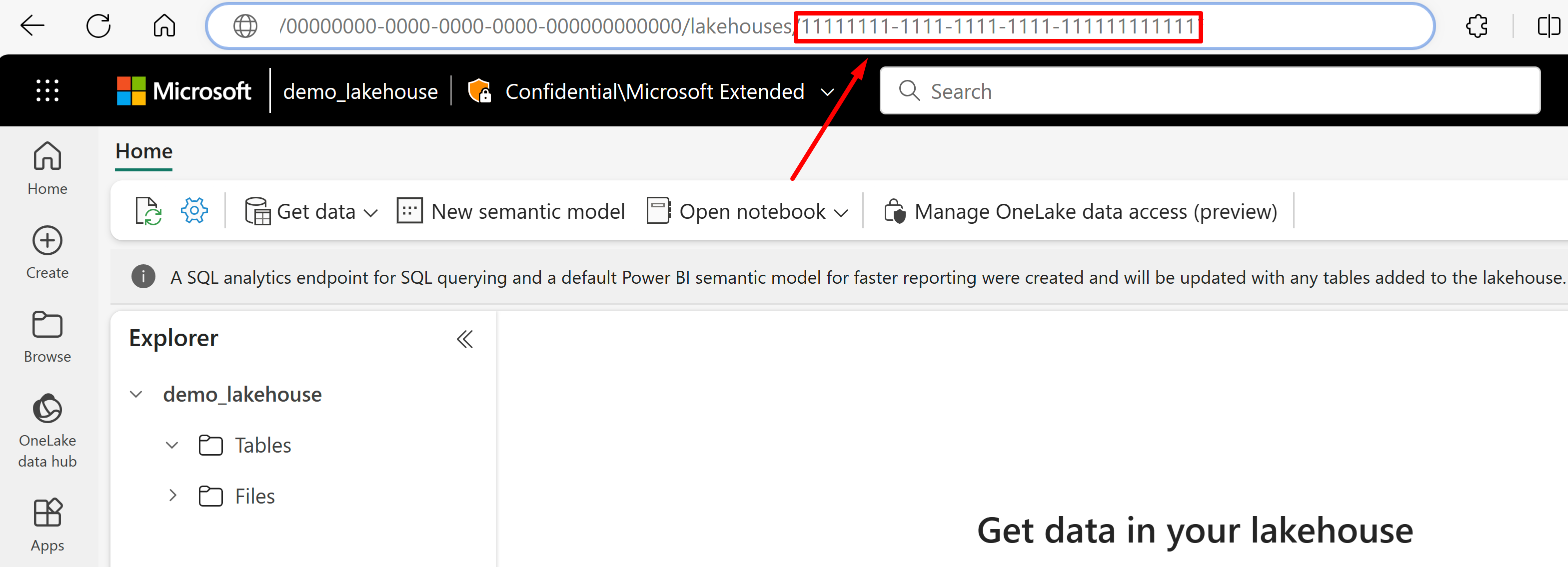 "type"to"onelake"(required).Get the Microsoft Fabric workspace GUID and the lakehouse GUID: