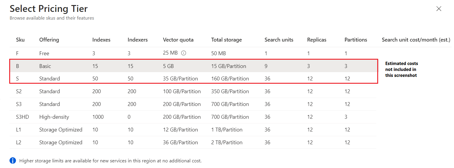 You can find out more about the various tiers on the pricing page, in the Service limits in Azure AI Search article, and on the Azure portal page when you're provisioning a service.