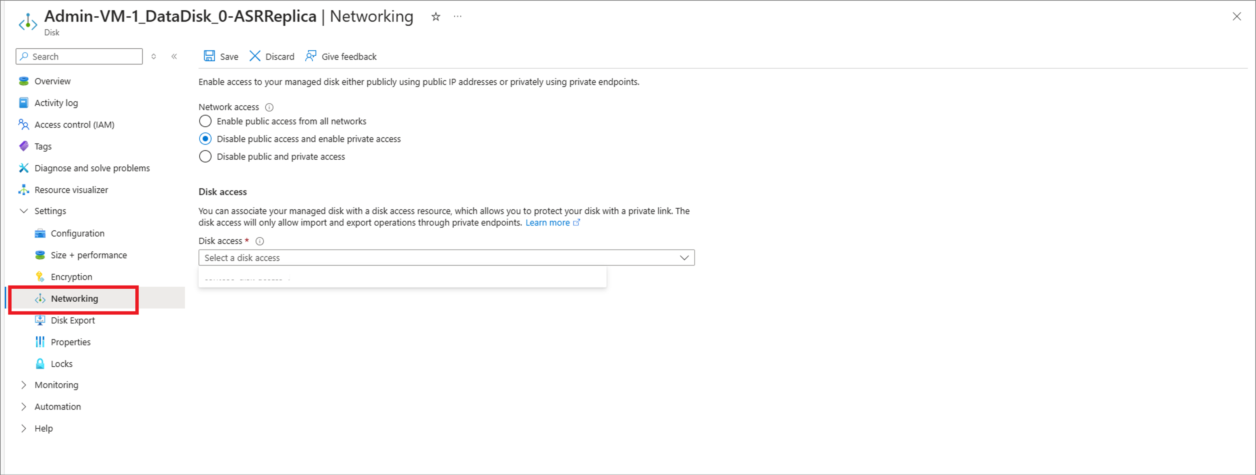 If you want to change disk network access to Disable public access and enable private access, the disk access resource to be used should already be present in the target region within the target subscription. Find the steps to create a disk access resource here.