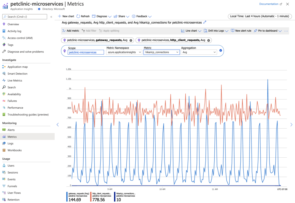 • In the navigation pane, select Metrics and select the namespace to see both Spring Boot metrics and custom metrics, if any.