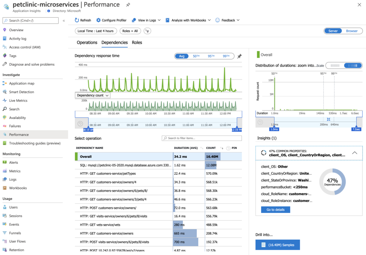 Screenshot of the Azure portal that shows the Application Insights Performance page.