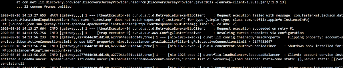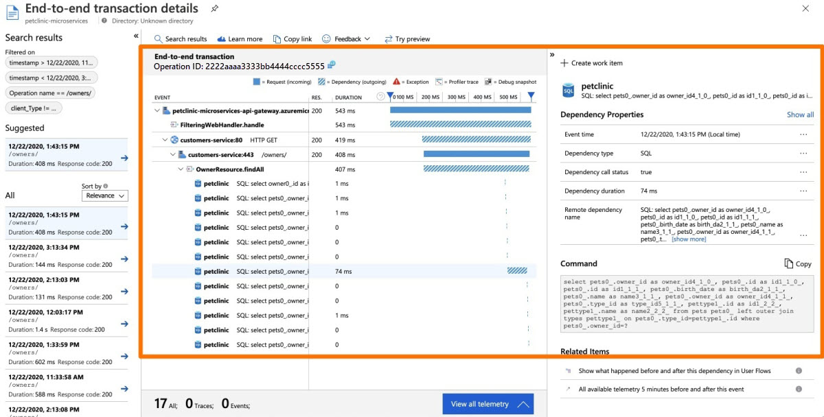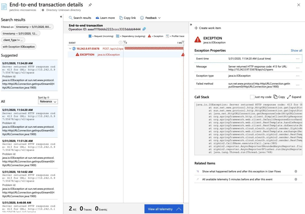 Select an exception to see the end-to-end transaction and stacktrace in context: