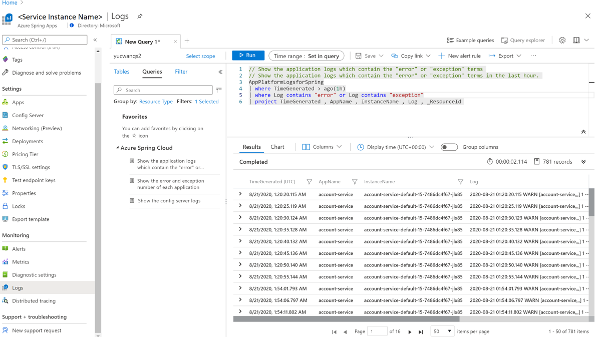 Go to the service | Overview page and select Logs in the Monitoring section. Select Run on one of the sample queries for Azure Spring Apps.