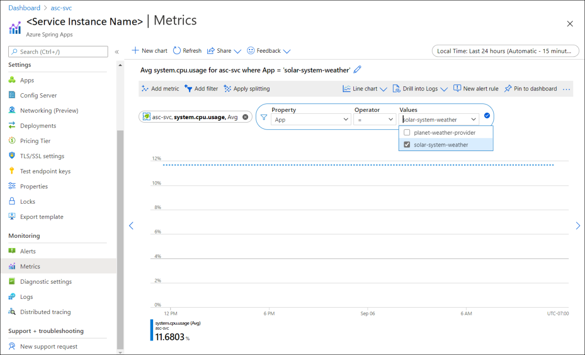 App=solar-system-weatherto see CPU usage only for the solar-system-weather app.Dismiss the filter created in the preceding step, select Apply Splitting, and select App for Values to see the CPU usage by different apps.