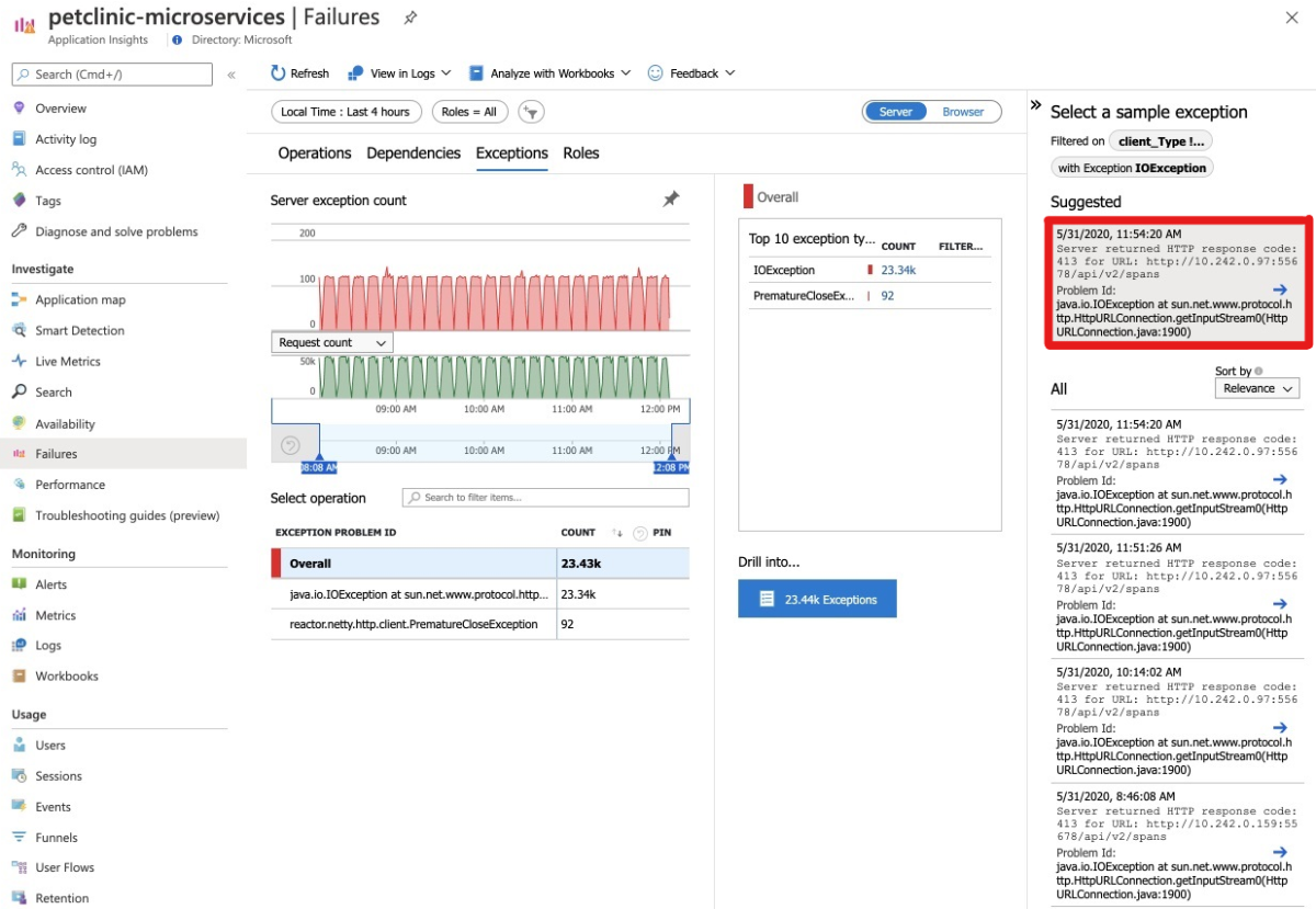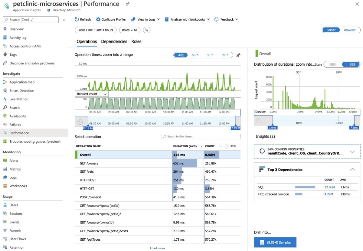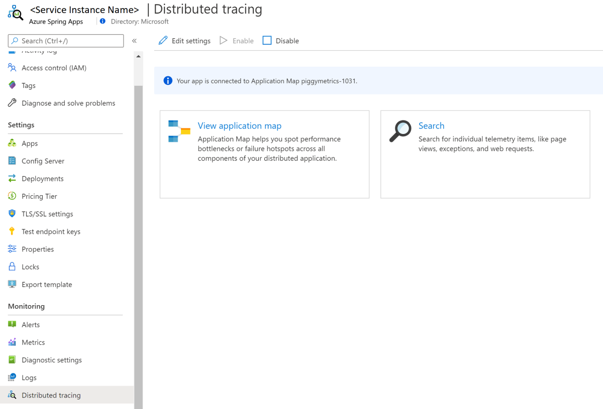 With the built-in monitoring capability in Azure Spring Apps, you can debug and monitor complex issues. Azure Spring Apps integrates Spring Cloud Sleuth with Azure's Application Insights. This integration provides powerful logs, metrics, and distributed tracing capability from the Azure portal. The following procedures explain how to use Log Streaming, Log Analytics, Metrics, and Distributed tracing with deployed PetClinic apps.