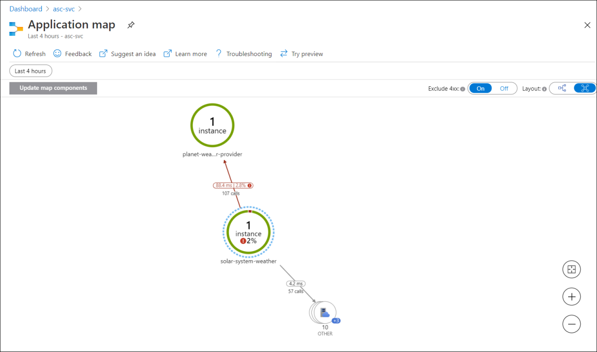 In the Azure portal, go to the service | Overview page and select Distributed tracing in the Monitoring section. Then select the View application map tab on the right.