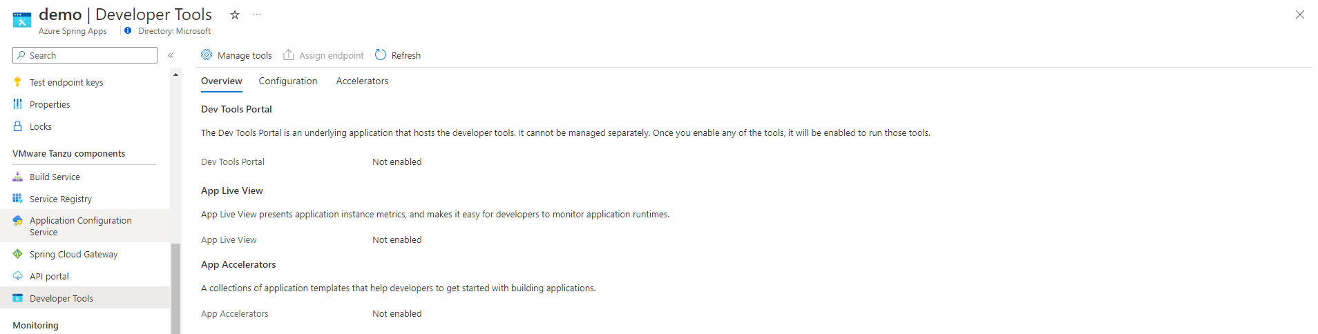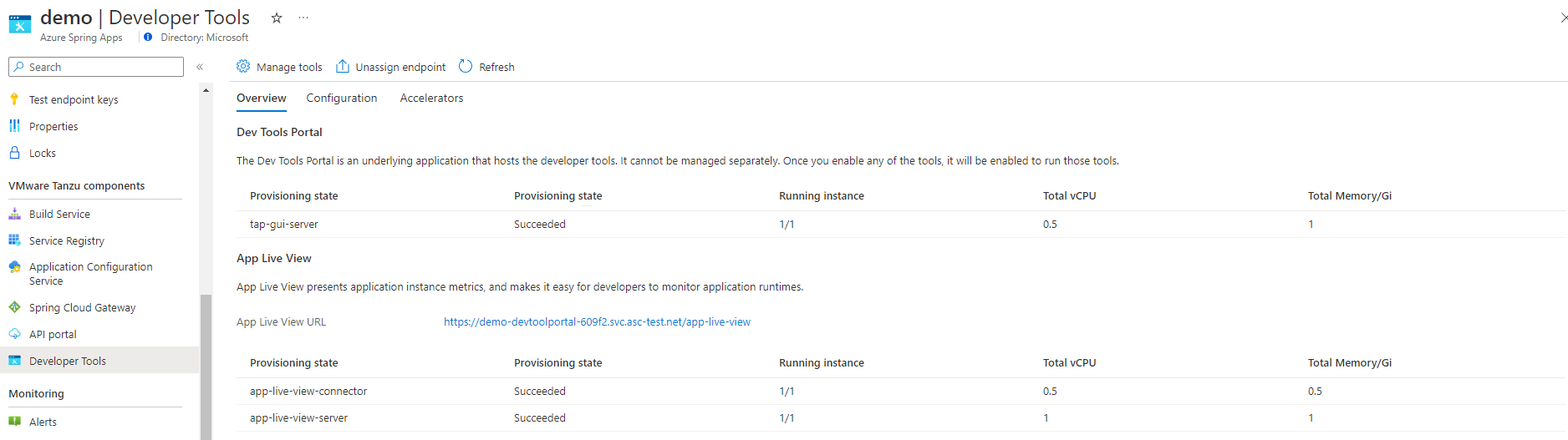 You can view the state of Application Live View in the Azure portal on the Overview tab of the Developer Tools page.