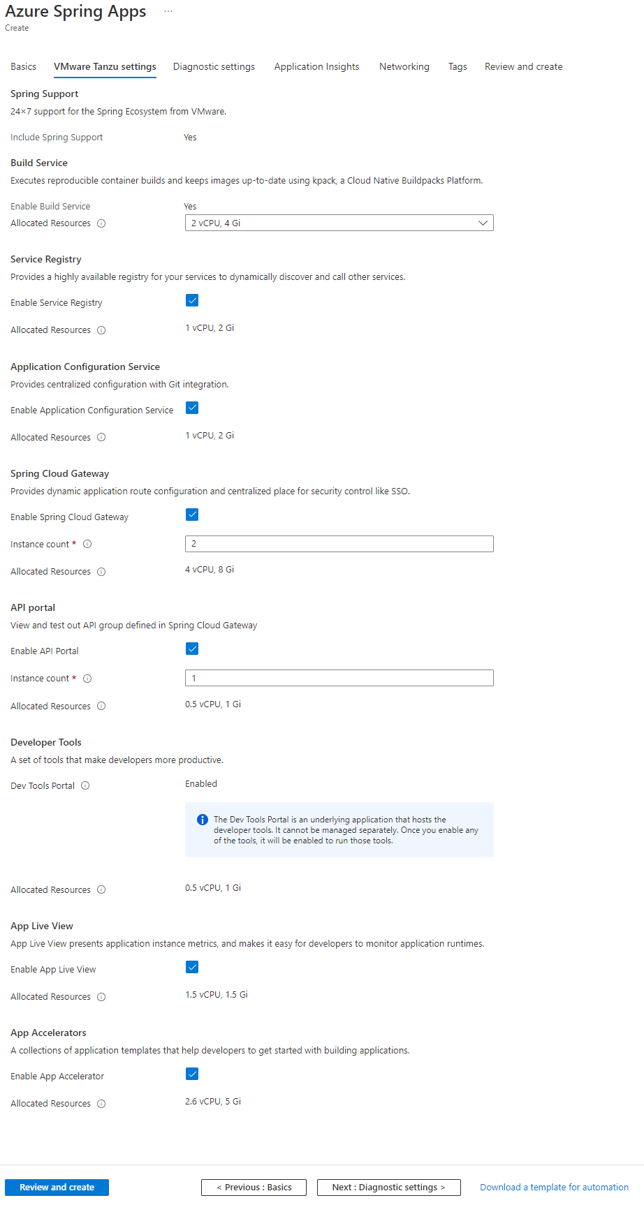 Make sure that Enable Application Live View and Enable Dev Tools Portal are set to Yes on the Review and Create tab, and then select Create to create the Enterprise plan instance.