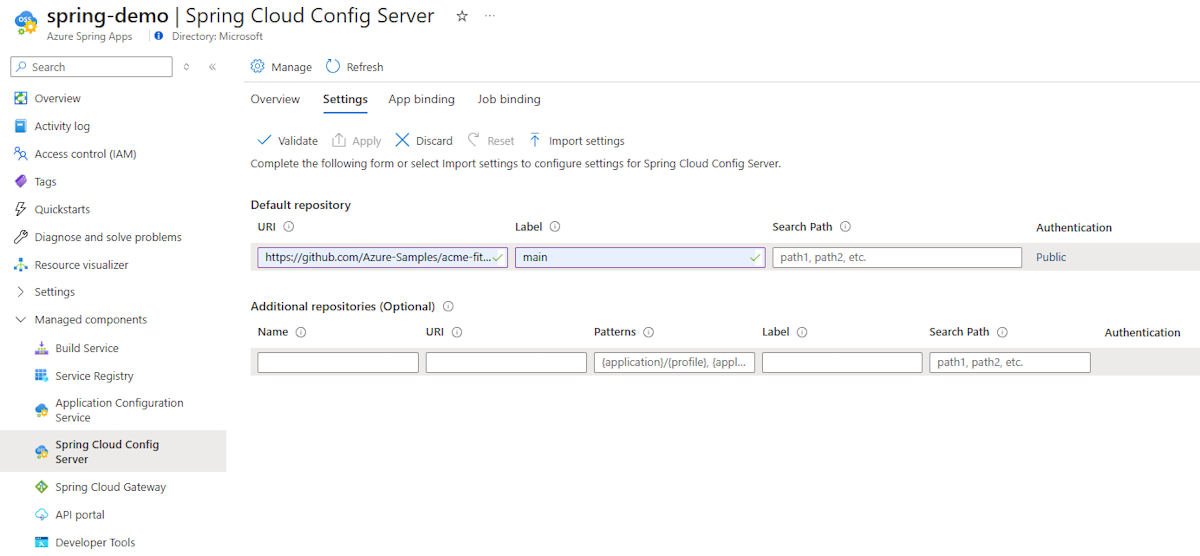 uri,label,search path,name, andauthenticationfrom ACS to Spring Cloud Config Server.After mapping configurations, select Validate to verify the configuration.