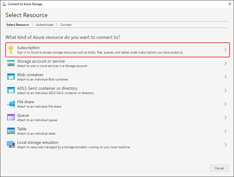 When you first start Storage Explorer, the Microsoft Azure Storage Explorer - Connect to Azure Storage window appears. While Storage Explorer provides several ways to connect to storage accounts, only one way is currently supported for managing ACLs.