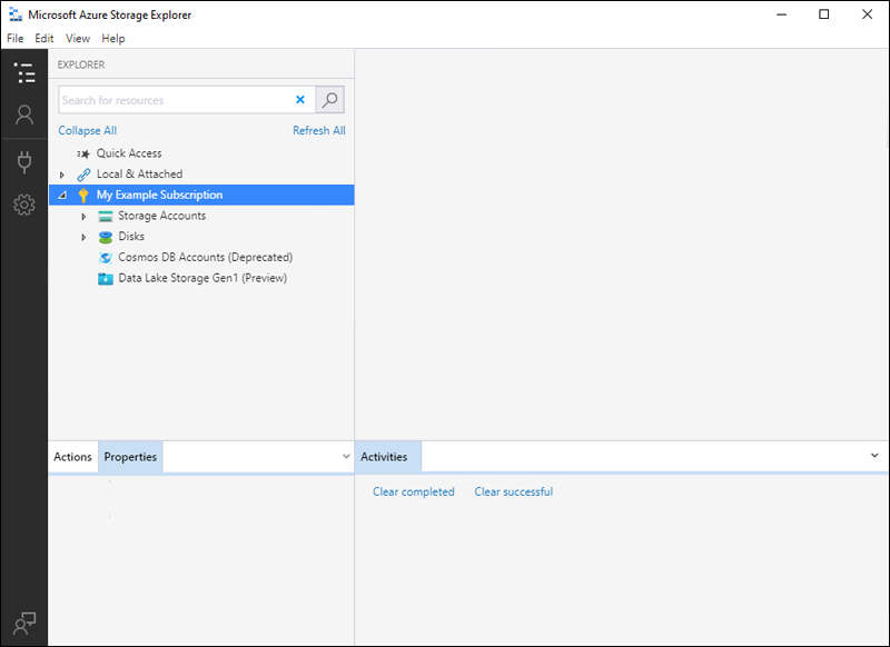 When it completes connecting, Azure Storage Explorer loads with the Explorer tab shown. This view gives you insight to all of your Azure storage accounts as well as local storage configured through the Azurite storage emulator or Azure Stack environments.