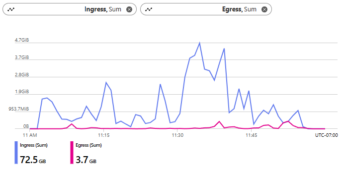 Select Add metric to combine the Ingress and Egress metrics on a single graph. This displays that 76.2 GiB (78,028 MiB) was transferred over one hour, which gives us an average throughput of 21.67 MiB over that same hour.